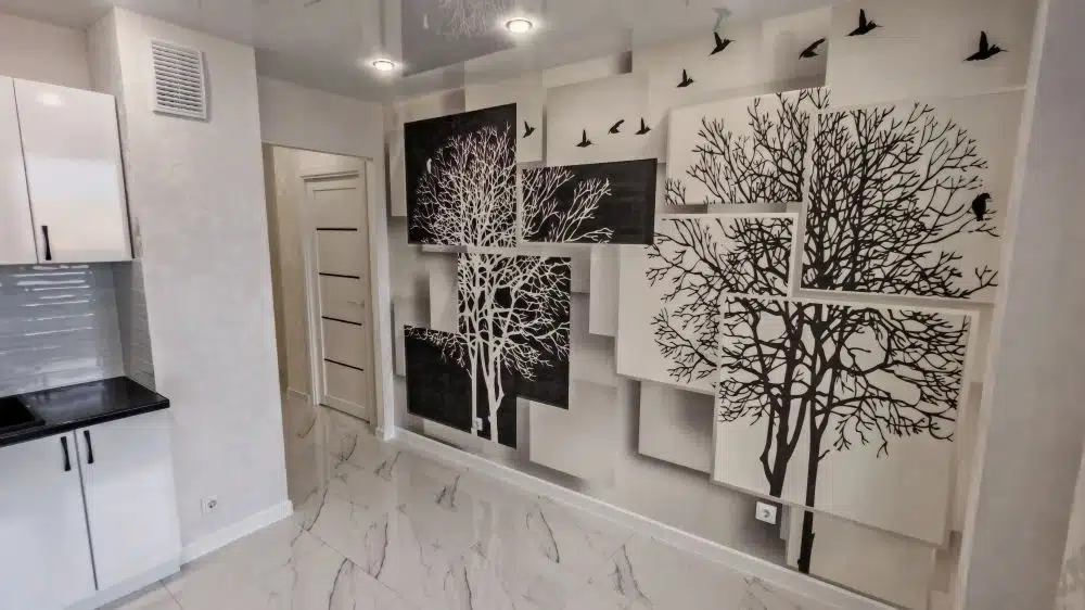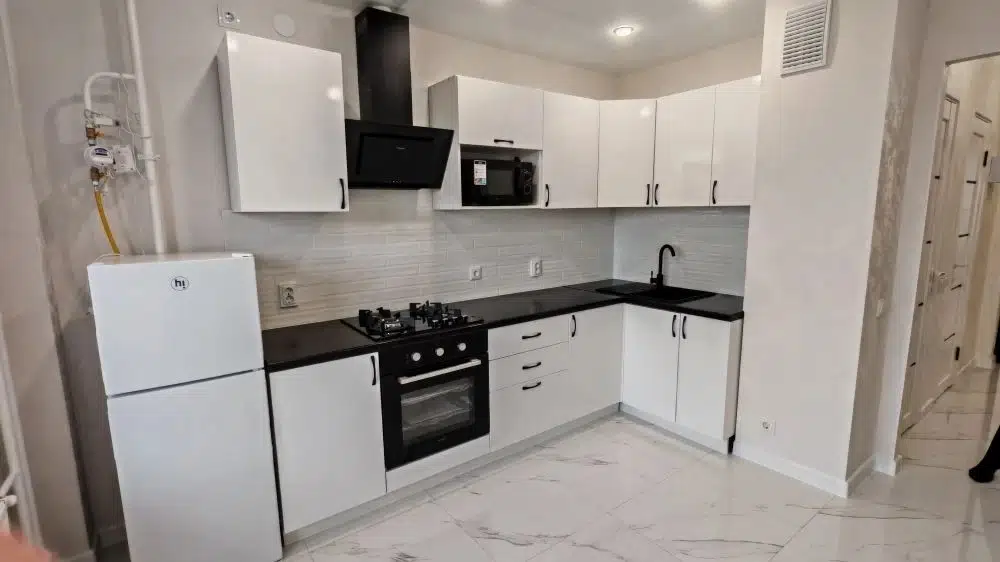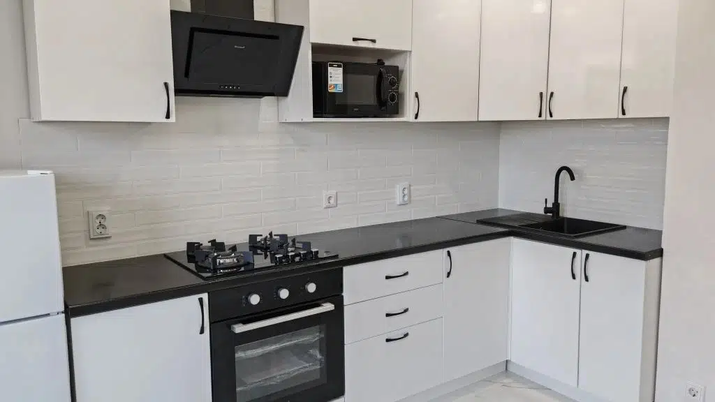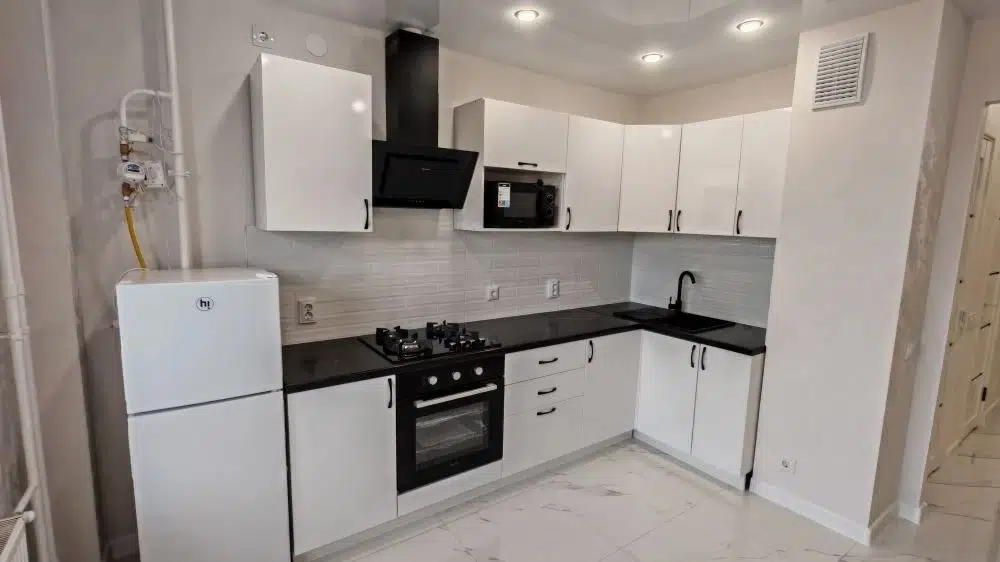 Кухня оборудована всей необходимой бытовой техникой : духовой шкаф , варочная поверхность, вытяжка, холодильник, микроволновая печь .